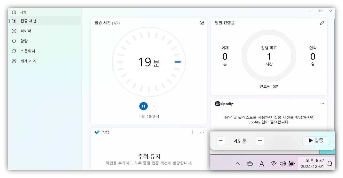 | 남은 시간 표시 | 집중 세션 남은 시간을 작업 표시줄에 표시하거나 숨길 수 있음 |