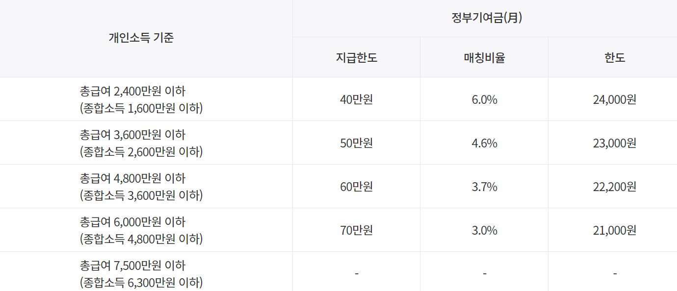 | 기여금 혜택 | 없음 | 소득별 3~6% 지원 | 소득별 3~6% 지원 |
