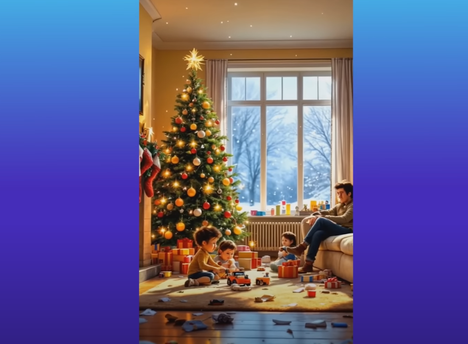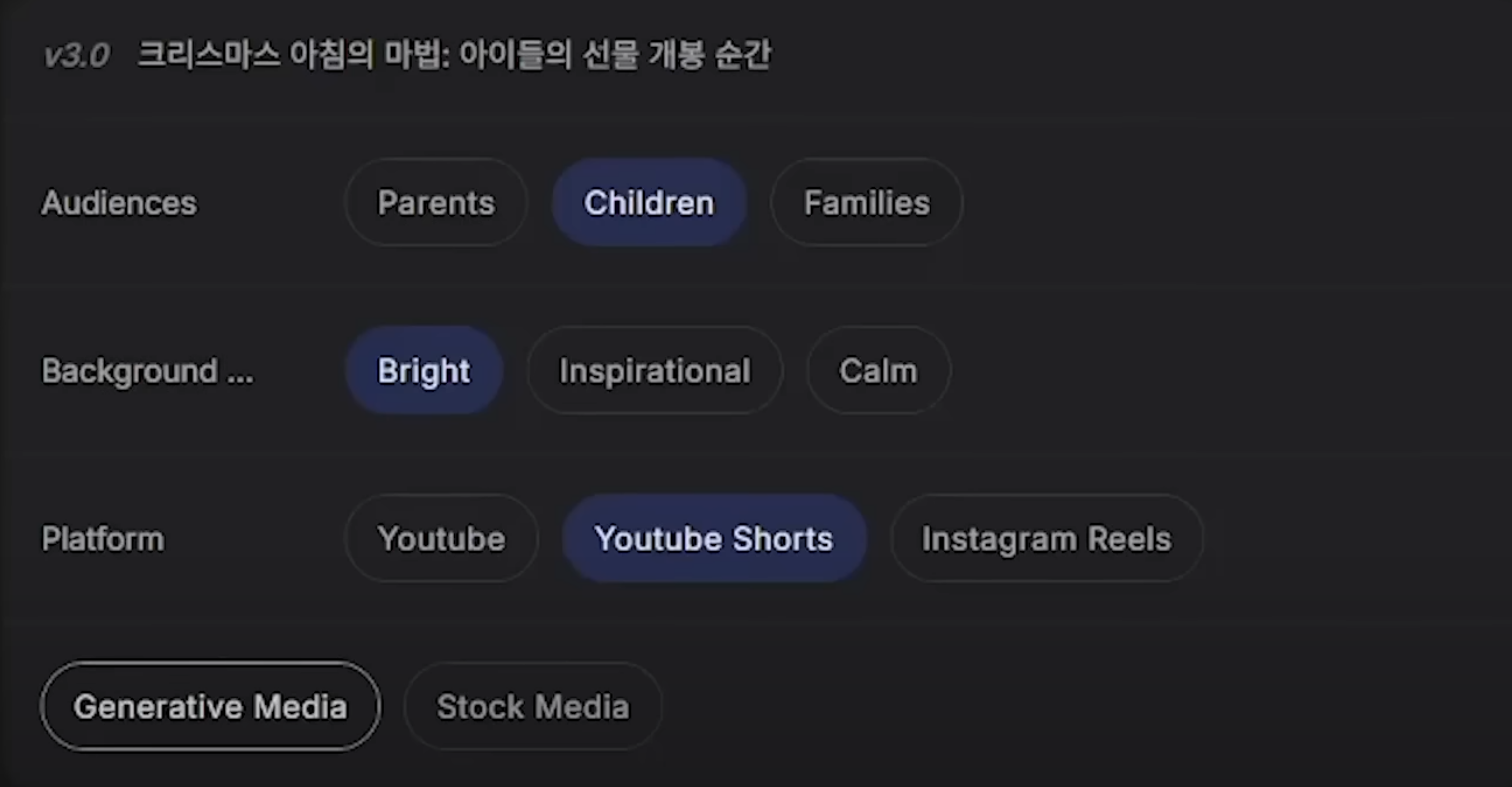 - 프롬프트 입력: "크리스마스 아침에 트리 아래 선물을 열어보는 아이들의 모습"을 입력하고, 영상 길이와 형식을 지정합니다.