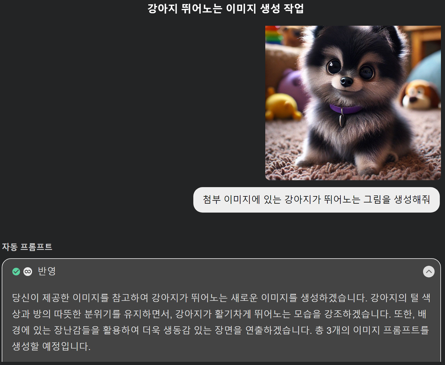 "첨부 이미지에 있는 강아지가 뛰어노는 이미지를 생성해줘"라고 입력하면, 플럭스 1, 플럭스 1.1 프로 울트라, 이디오그램, 달리에서 각각 이미지를 생성합니다. 자동 프롬프트 기능을 사용하면, 입력한 프롬프트를 기반으로 더 구체적이고 상세한 프롬프트를 생성하여 이미지를 생성합니다.