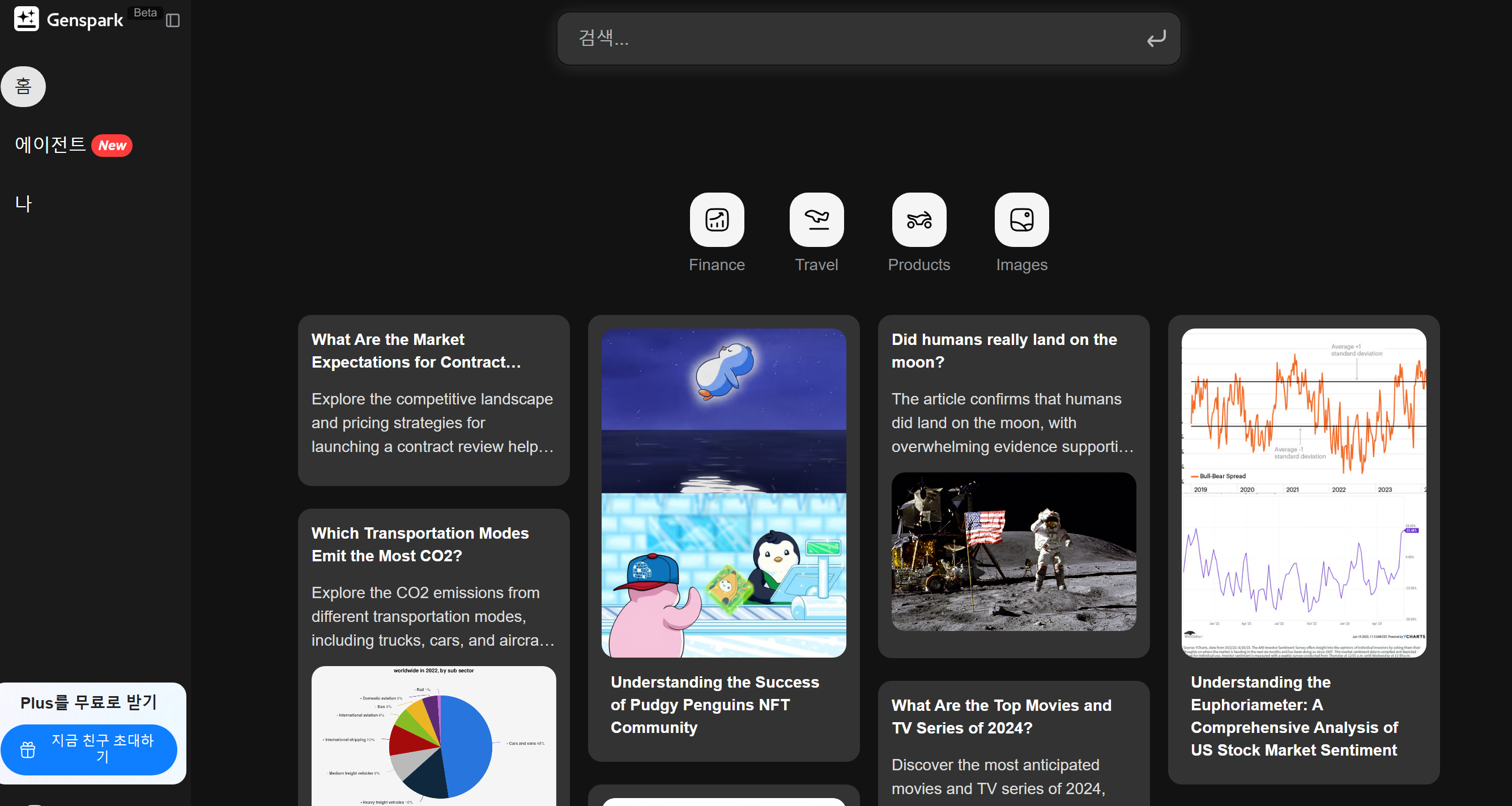 젠스파크에 들어가면 어제 업데이트가 되었는데, 완전히 새롭게 바뀌었습니다. 마치 퍼플렉시티와 비슷한 느낌으로, 다른 사람들이 만들어 놓은 결과물도 공개 게시물처럼 볼 수 있습니다. 그리고 가장 중요한 변화는 '에이전트'라는 부분이 새로 생겨났다는 것입니다.