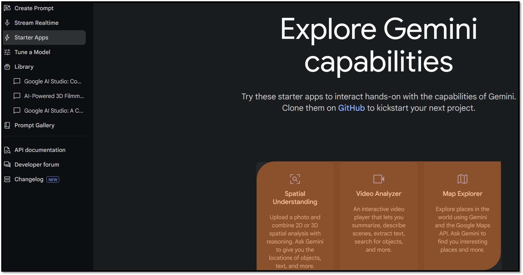 AI 스튜디오의 '스타터 앱' 기능은 정말 강력합니다! 제공되는 다양한 예제들을 통해서 여러분의 앱에 AI 기능을 적용할 수 있습니다. GitHub 연동을 통해 새로운 프로젝트를 만들 수도 있고, 맵, 스페셜, 비디오 등 다양한 툴을 제공합니다. 🛠️