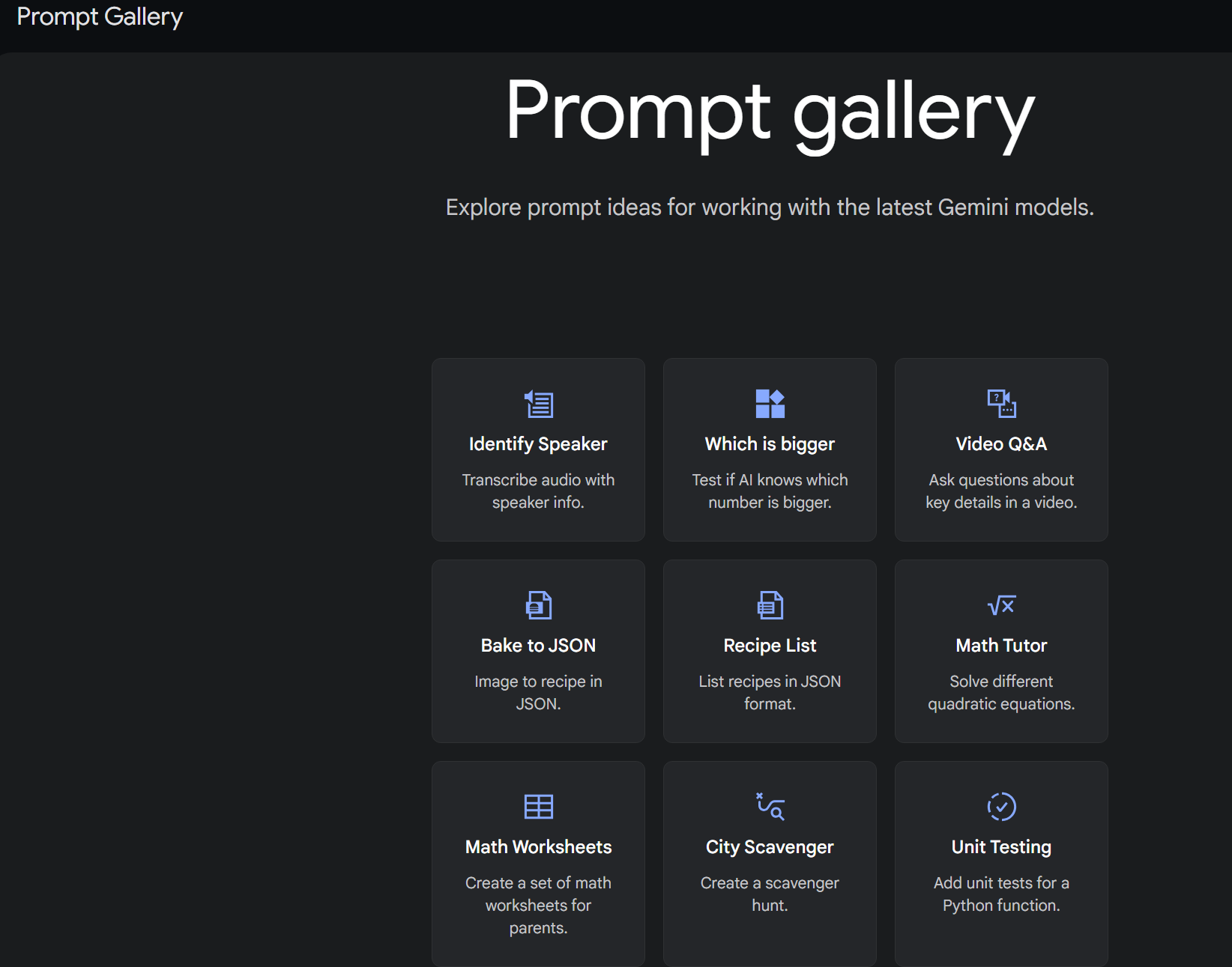 다음은 이미지에 보이는 Google AI Studio 프롬프트 갤러리의 프롬프트들을 표 형식으로 정리한 것입니다.