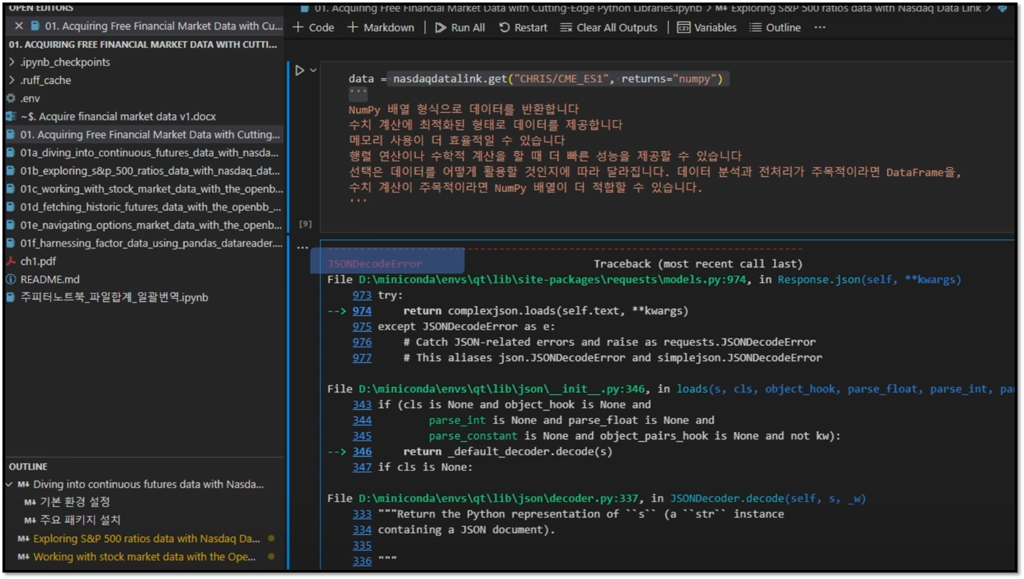 AI: "에러 메시지를 보니 JS 코드에러가 발생했네요. 이것은 JSON 형식으로 되어 있는 데이터를 파이썬이 제대로 읽어들이지 못할 때 생기는 오류입니다. 특히 ValueError와 함께 나타나는 것으로 보아, API 응답 자체에 문제가 있는 것으로 보입니다. 데이터 소스에서 제공하는 API 키를 잘못 입력하지 않았는지 확인해 보시는 것이 좋겠습니다."