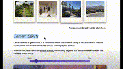 월드 랩스 기술의 매력은 여기서 끝이 아닙니다! 다양한 카메라 효과를 실시간으로 적용할 수 있다는 점인데요. 심도 조절(Depth of Field) 기능을 활용하면, 마치 전문 카메라로 촬영한 듯 피사체에만 초점을 맞추고 배경을 흐릿하게 처리하는 효과를 낼 수 있습니다. 슬라이드 바를 움직이는 것만으로 초점 거리가 실시간으로 변하는 것을 확인할 수 있습니다. 멀리 있는 피사체에 초점을 맞추면 배경이 흐려지고, 가까운 피사체에 초점을 맞추면 주변이 흐릿해지는 마법! ✨