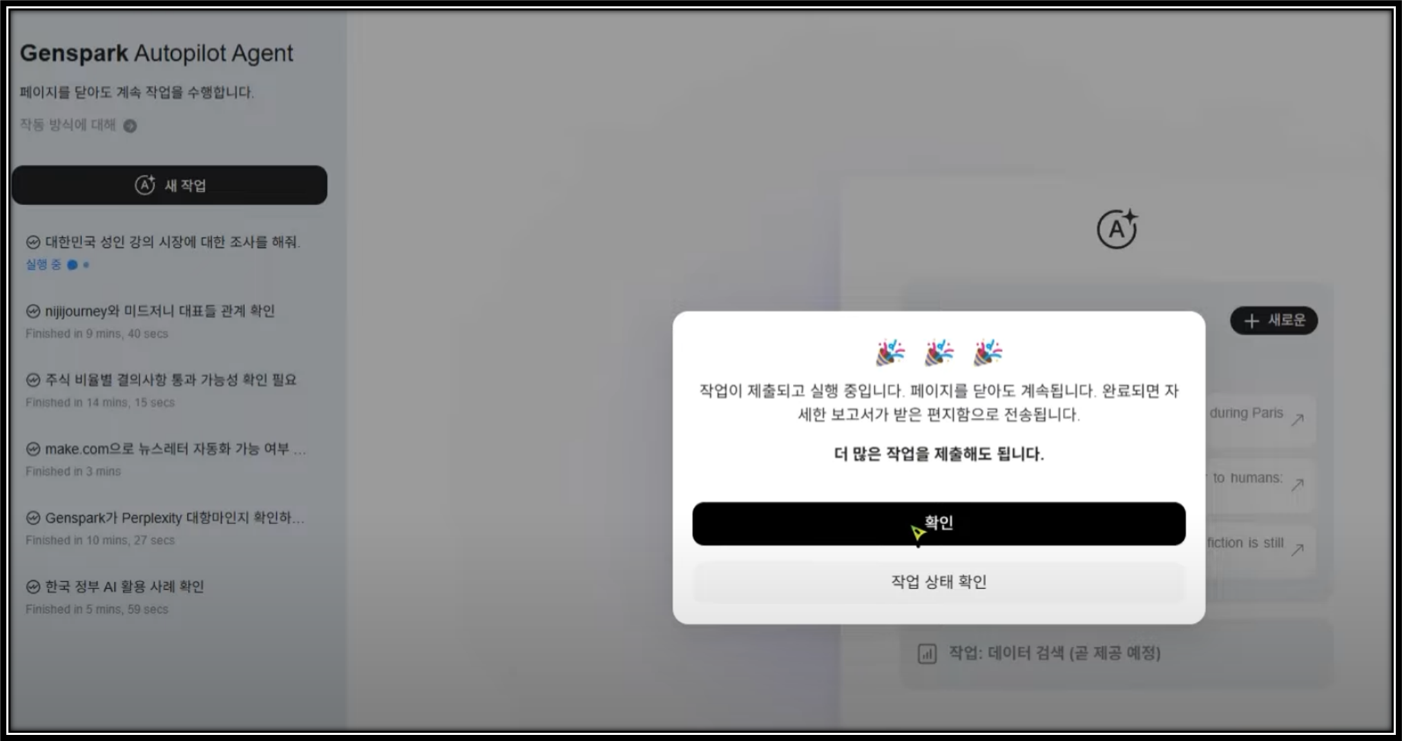 젠스파크에는 '오토파일럿 에이전트'라는 기능도 있습니다. 젠스파크 메인 화면 하단에서 '오토파일럿'을 선택한 후, '새 작업'을 클릭하여 동일한 질문을 입력해 보겠습니다. 이 기능은 백그라운드에서 자동으로 작업을 수행하며, 완료되면 이메일로 알림을 보내줍니다.