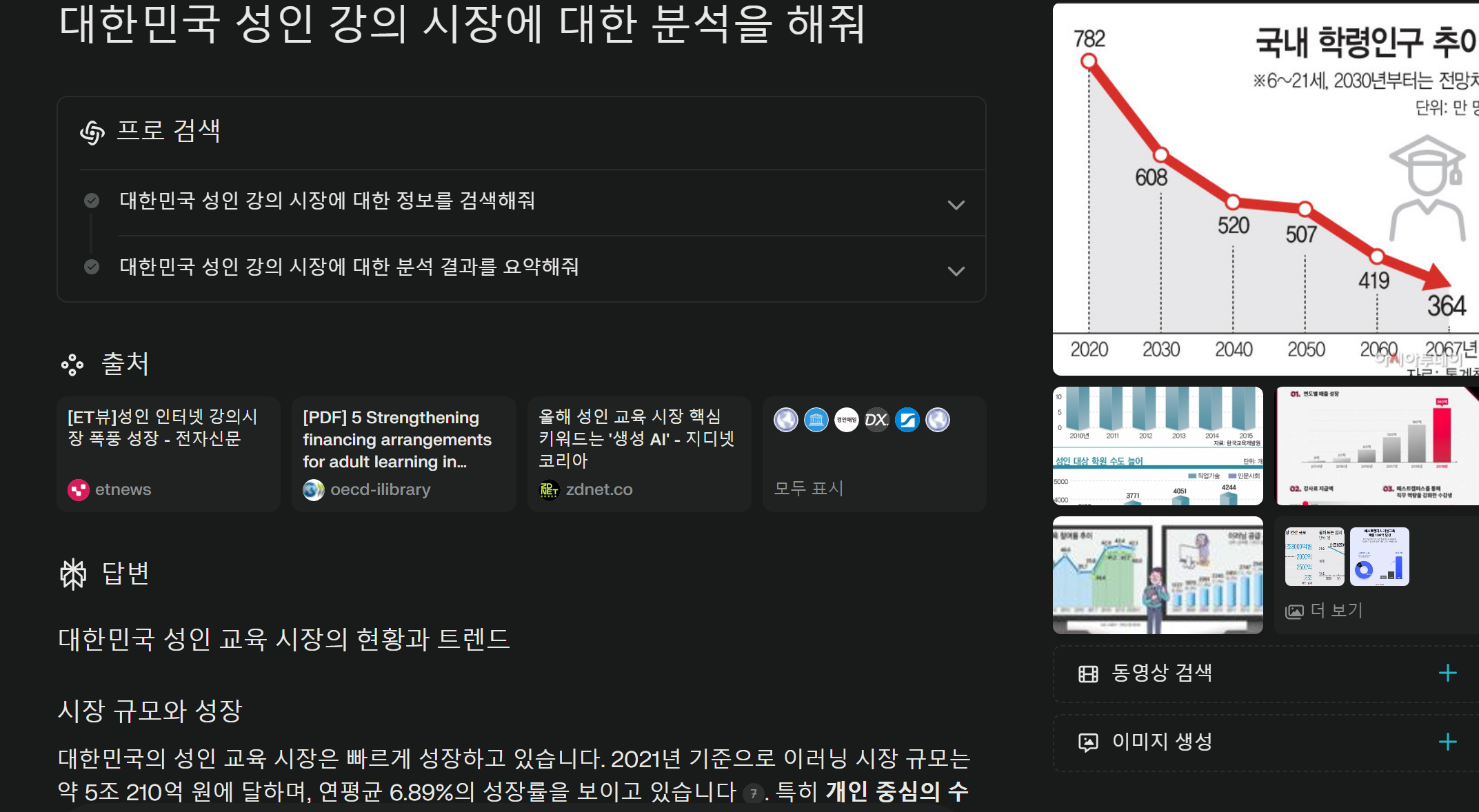 다음으로는 퍼플렉시티에 똑같은 질문을 해보겠습니다. 저는 퍼플렉시티 유료 버전을 사용하고 있으며, 검색 모드는 '전체 모드', 웹 검색으로 설정했습니다. 퍼플렉시티의 특징 중 하나는 질문에 대한 세부적인 하위 태스크를 생성하고, 이를 순차적으로 수행하는 방식으로 정보를 탐색한다는 점입니다. '모두 표시' 버튼을 눌러 확인해 보니, 퍼플렉시티는 10개의 출처를 인용하여 답변을 구성했습니다. ChatGPT보다 더 많은 자료를 참고했다는 것을 알 수 있습니다. 답변 내용은 시장 규모, 성장성, 트렌드, 교육 분야 시장 특성, 미래 전망 등 체계적인 구조로 정리되어 있습니다. 각 항목 옆에 표시된 출처 링크를 클릭하면 해당 웹사이트로 바로 이동할 수 있습니다.