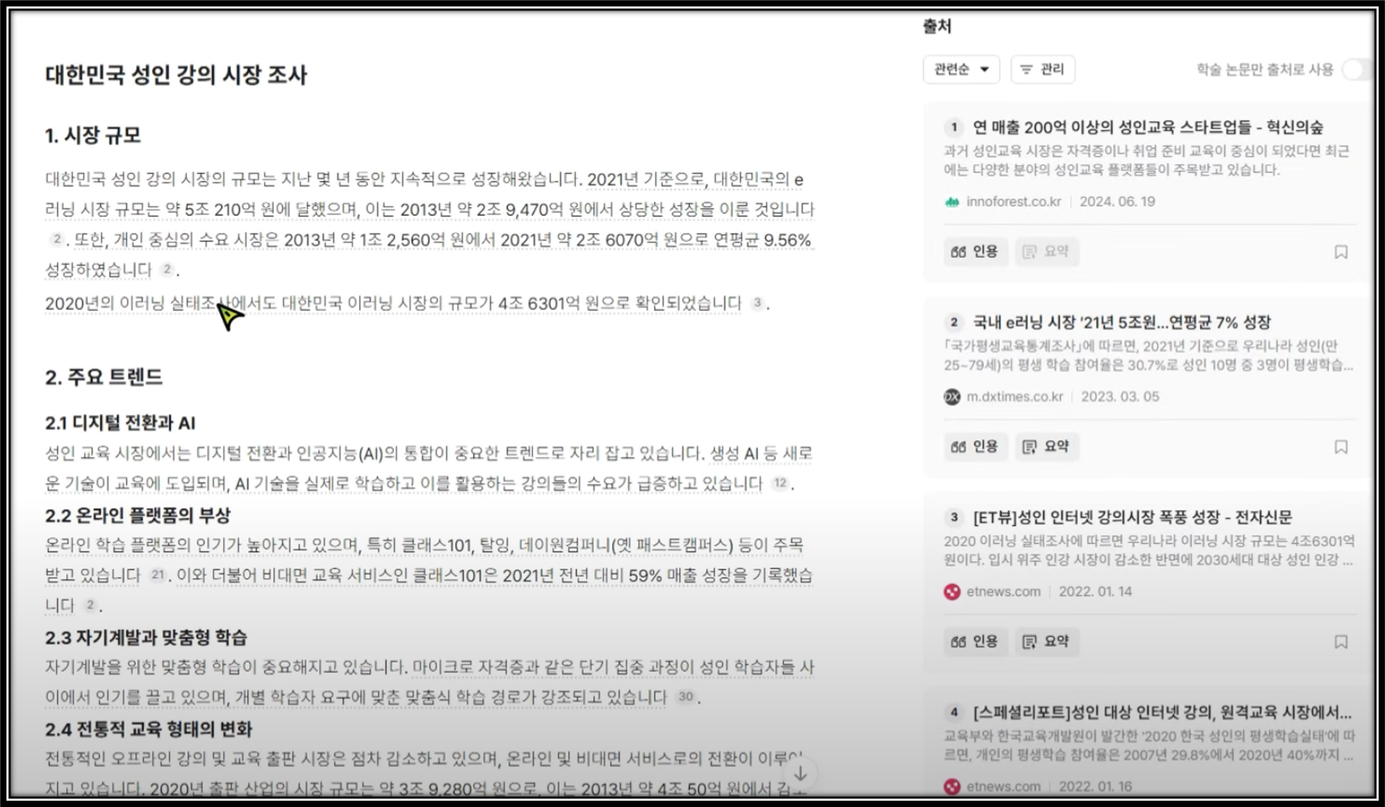 마지막으로 살펴볼 툴은 라이너입니다. 동일하게 '대한민국 성인 강의 시장에 대한 시장 조사를 해줘' 라고 질문했습니다. 라이너 역시 훌륭한 답변을 제공해 주었습니다. 시장 규모, 주요 트렌드, 인기 강의 분야, 사업자, 미래 전망까지 핵심적인 내용을 잘 정리해 주었고, 관련 질문도 함께 제시해 줍니다. 라이너가 참고한 출처 수를 보니 꽤 많은 웹사이트를 검색했다는 것을 알 수 있습니다. 인터페이스 디자인이나 정보 제공 방식이 ChatGPT의 SearchGPT와 매우 유사한데, SearchGPT가 나중에 출시된 것을 감안하면 SearchGPT가 Liner를 참고했을 가능성이 높습니다. 사실 라이너는 국내 기술로 개발된 서비스입니다. 글로벌 시장에서도 인정받고 있으며 많은 주목을 받고 있다고 하니, 국내 서비스의 저력을 보여주는 사례라고 할 수 있겠습니다.