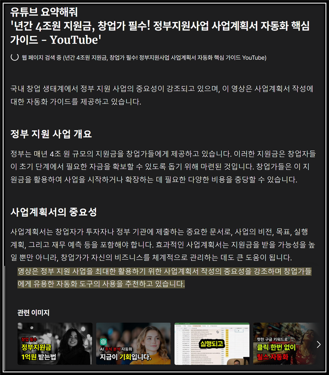 라이너는 단순히 텍스트 검색뿐 아니라 유튜브 영상 요약 기능도 제공합니다. 타 AI 서비스가 유튜브 URL을 제대로 분석하지 못하거나, 스크립트가 없어 읽을 수 없다는 반응을 보이는 것과는 대조적입니다.