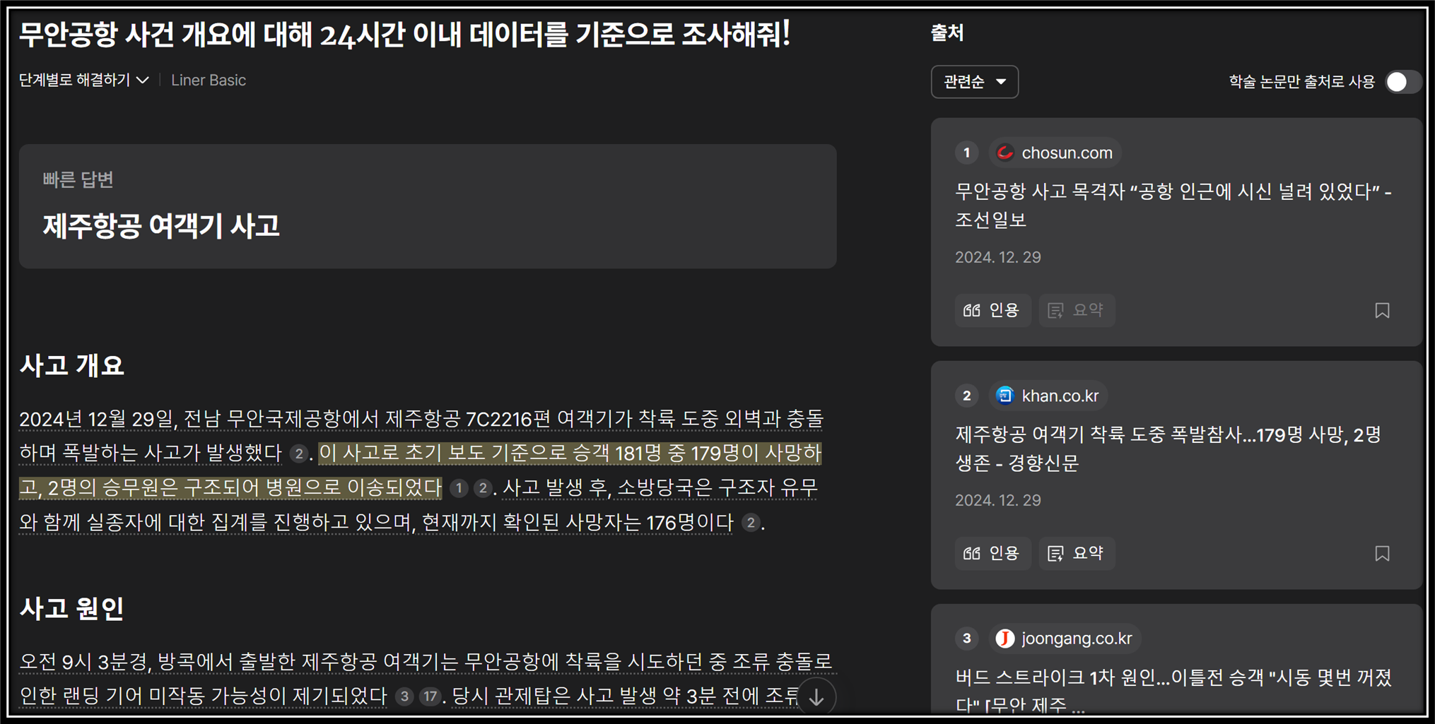 퍼플렉시티도 출처를 제공하지만, 라이너는 출처를 선별하는 데 더욱 고도화된 기술을 사용합니다. 예를 들어, 위키피디아는 학술 자료로 적합하지 않다는 점을 고려하여, 위키피디아보다 더 권위 있는 사이트가 우선적으로 표시되도록 합니다. - 학술 검색에 최적화된 서비스!