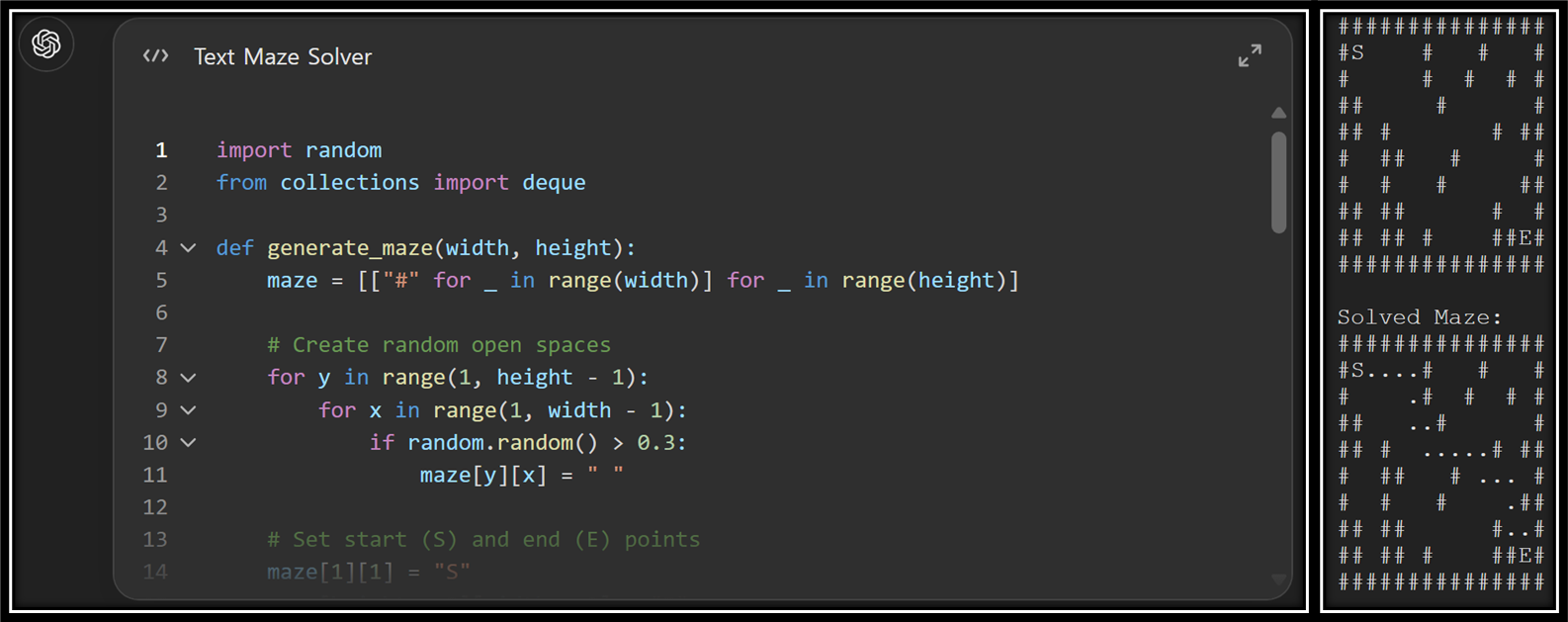 미로 생성: 무작위로 벽(#)과 길( )을 배치하여 텍스트 기반의 미로를 생성합니다.