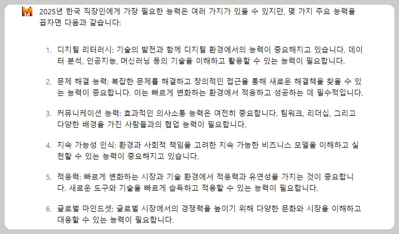 자, Chat GPT의 능력을 한번 시험해 볼까요? 2025년 대한민국 직장인이 성공적인 커리어를 위해 어떤 업무 능력을 키워야 할지 물어보았습니다.
