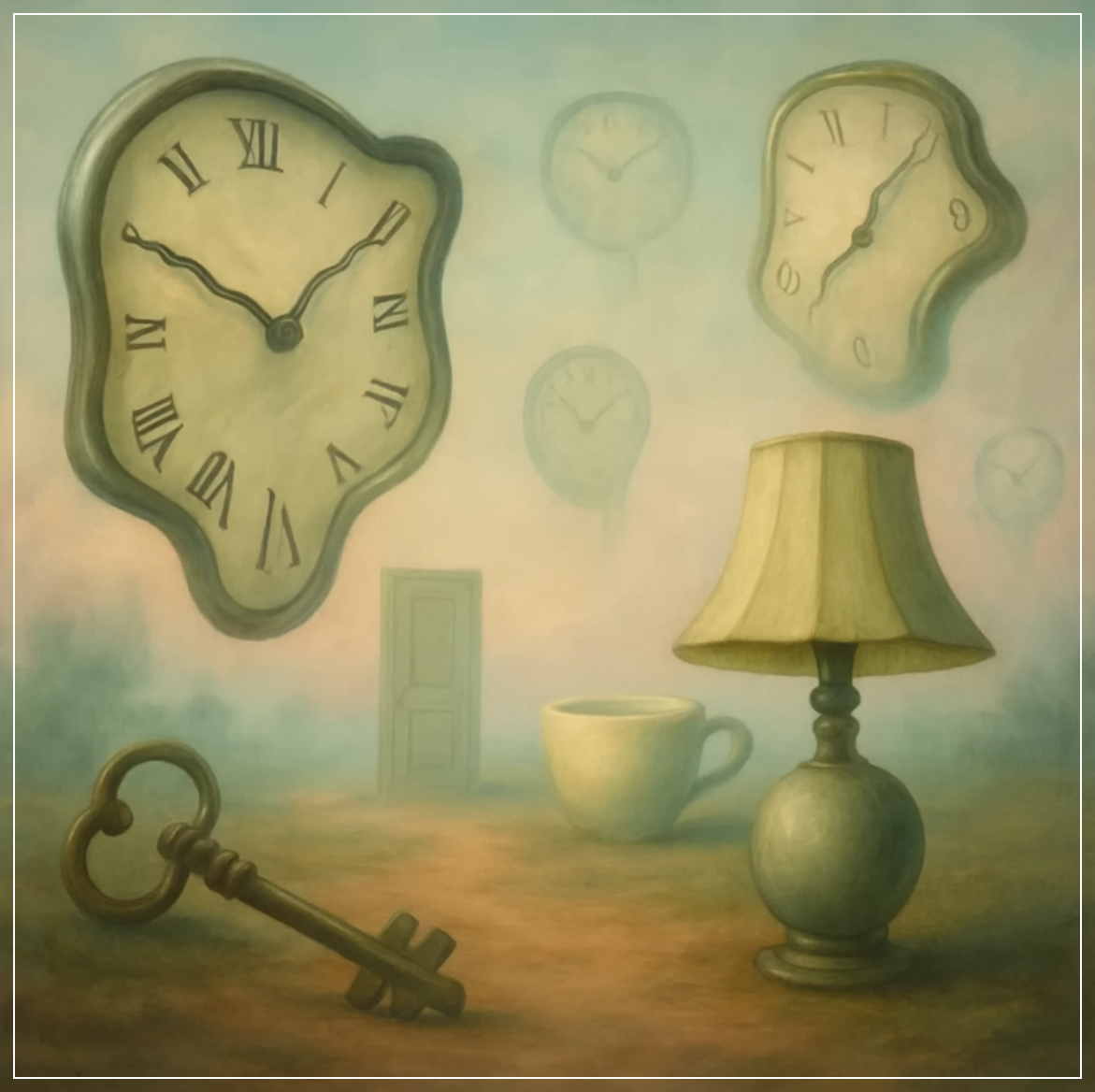 Prompt: Create a dreamcore style image of a surreal landscape with floating, distorted clocks, oversized objects, and a hazy, dreamlike atmosphere. Square Ratio.