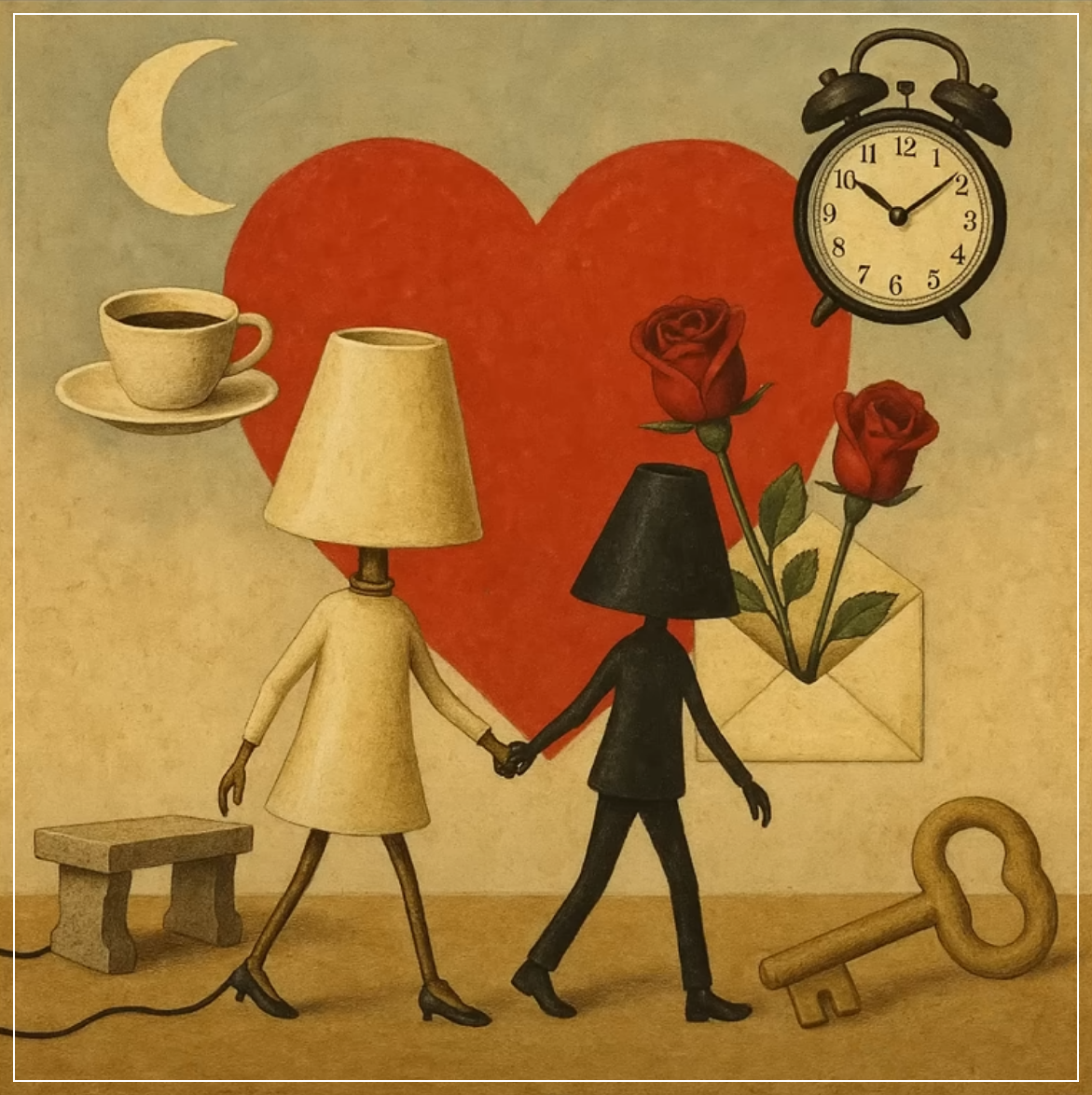 Prompt: Create a dadaism image of a surreal scene representing love, where everyday objects are placed in unexpected, nonsensical arrangements. Square Ratio.