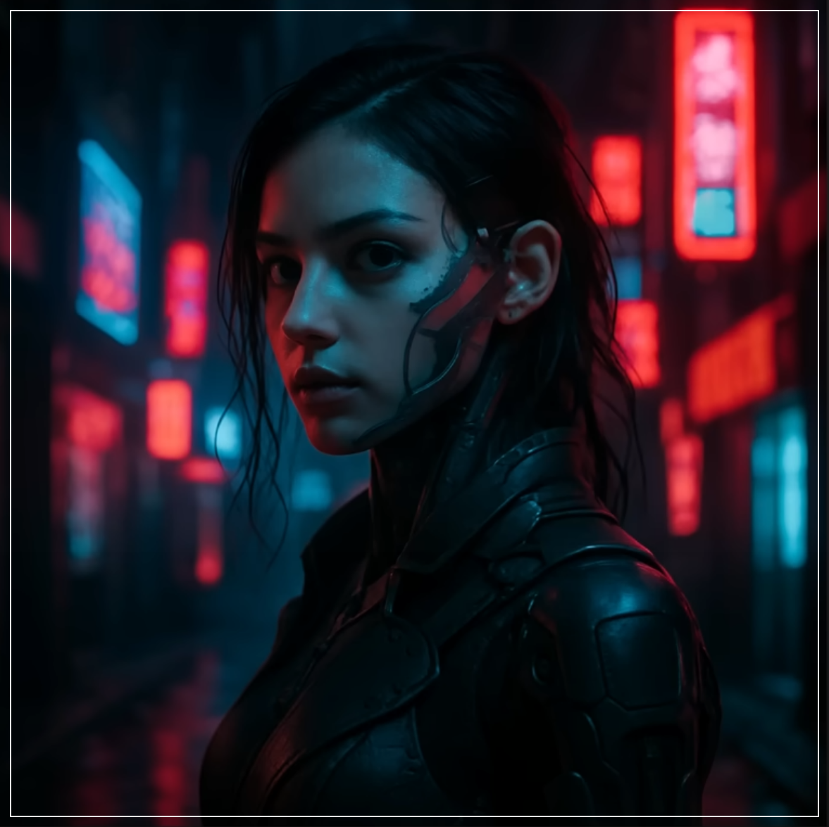 Prompt: Create a cyberpunk portrait photo of a woman with cybernetic enhancements, standing in a dark alley with glowing advertisements. Square Ratio.