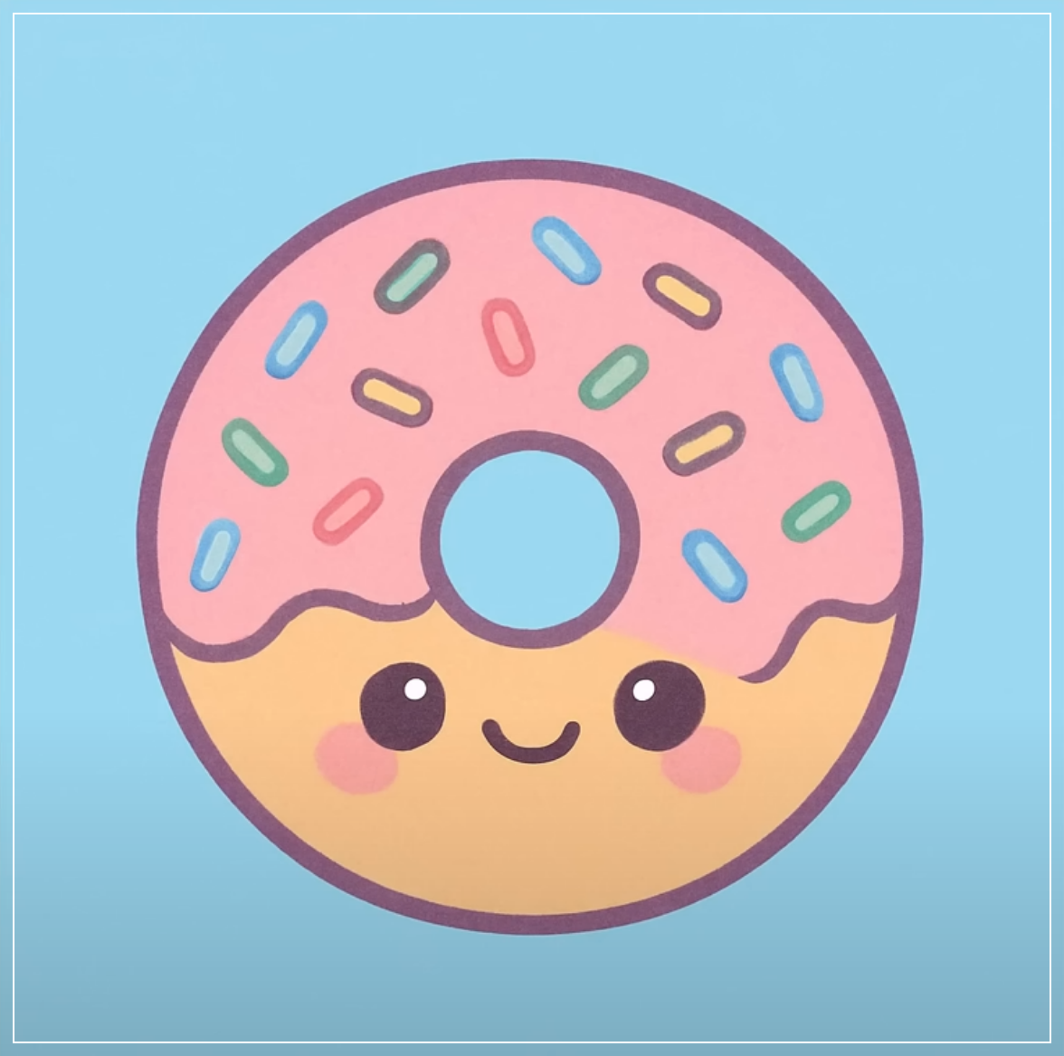 Prompt: Create an image of a kawaii-style smiling donut with sprinkles, with a cute face, on a solid light blue background. Square Ratio.