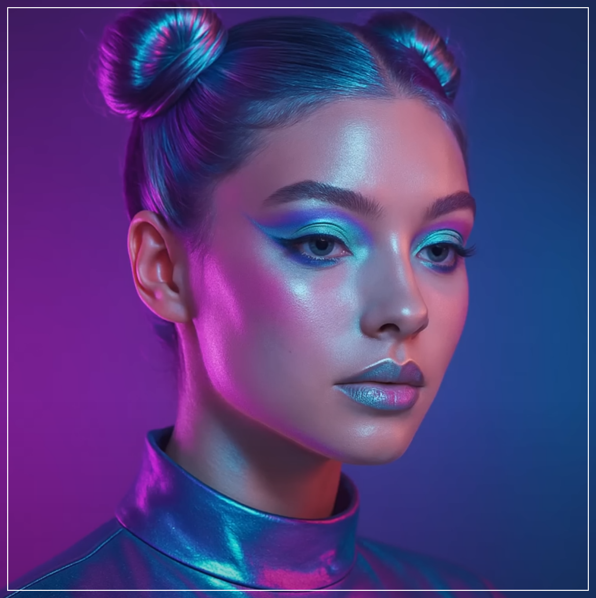 Prompt: Create a Y2K aesthetic portrait of a girl with holographic makeup and a futuristic, metallic hairstyle. Square Ratio.