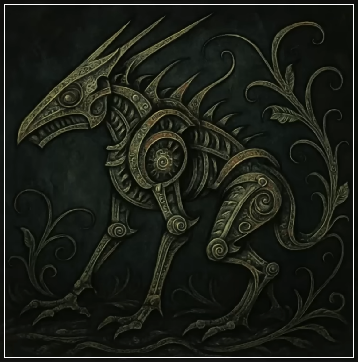 Prompt: Create a zettiology image of a mechanical creature, blending sharp edges with flowing, natural designs, in a dark, atmospheric setting. Square Ratio.