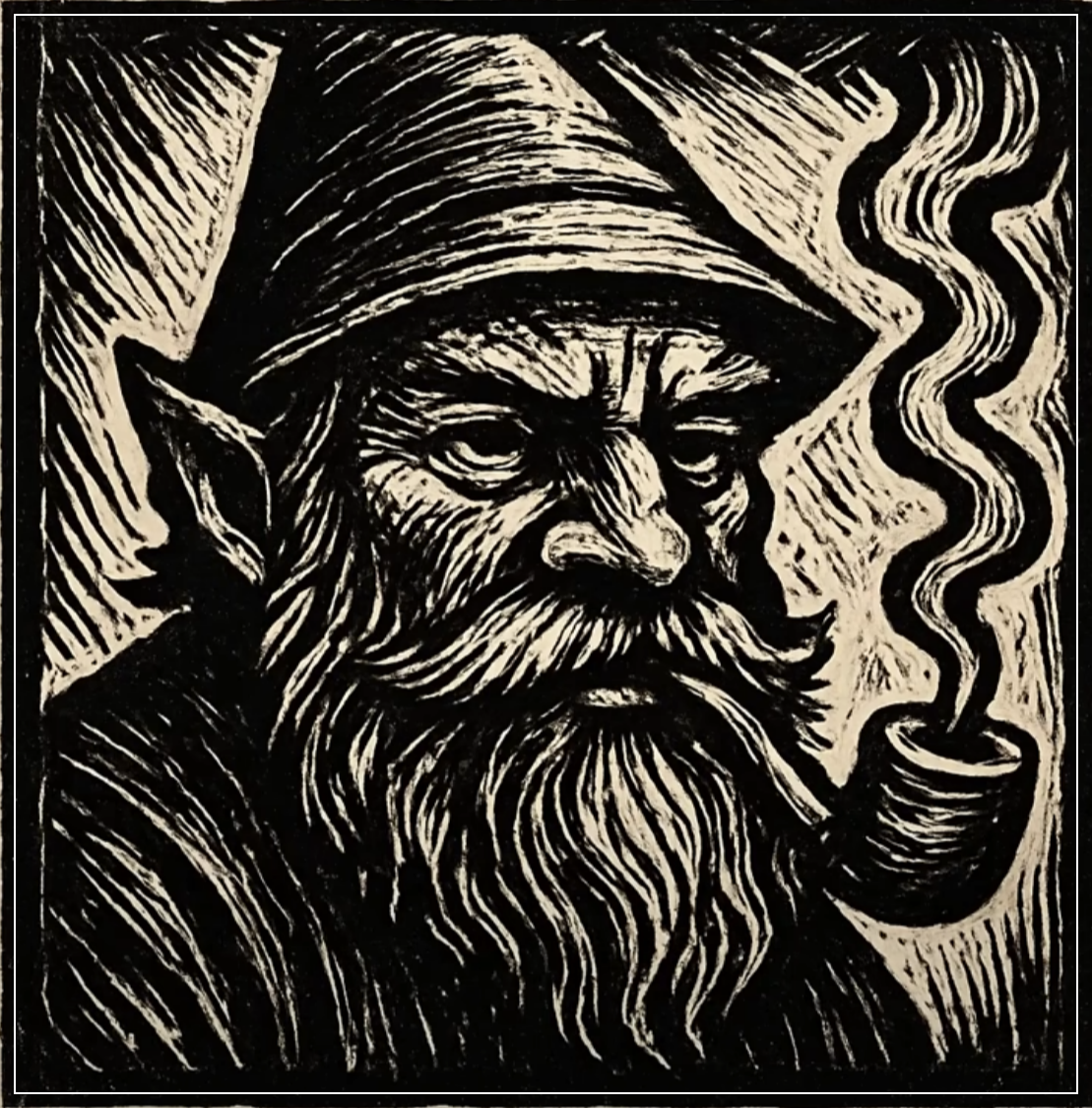 Prompt: Create an image of bold woodcut print of a gnome portrait smoking from a pipe. Square Ratio.