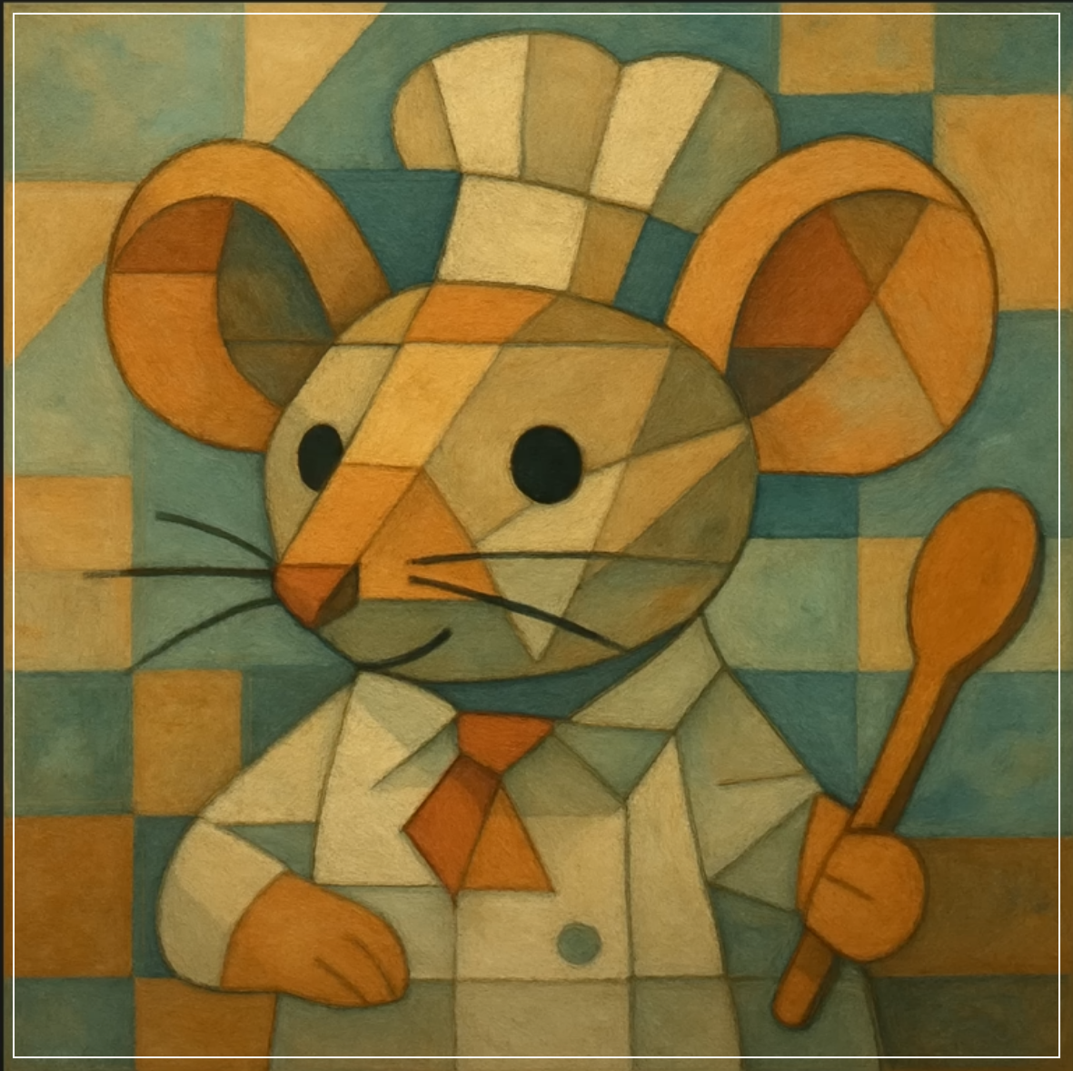 Prompt: Create an image of a cute cubist illustration with a mouse with a cook hat, fragmented geometric forms. Square Ratio.