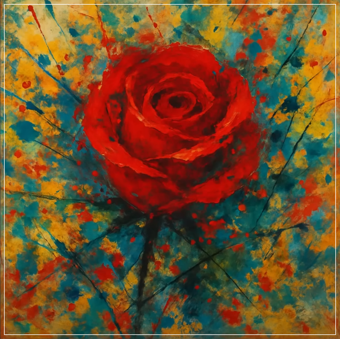 Prompt: Create a tachisme image of a red rose, energetic canvas filled with expressive splashes of color and random brush marks. Square Ratio.