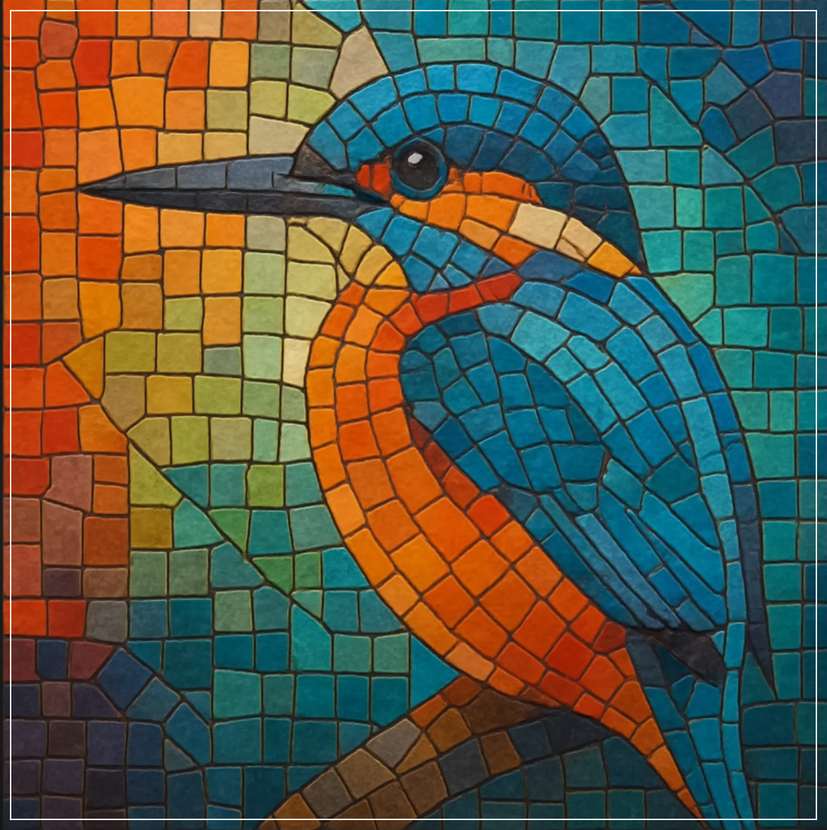 Prompt: Create a mosaic image of a colorful bird made up of small, geometric tiles. Square Ratio.