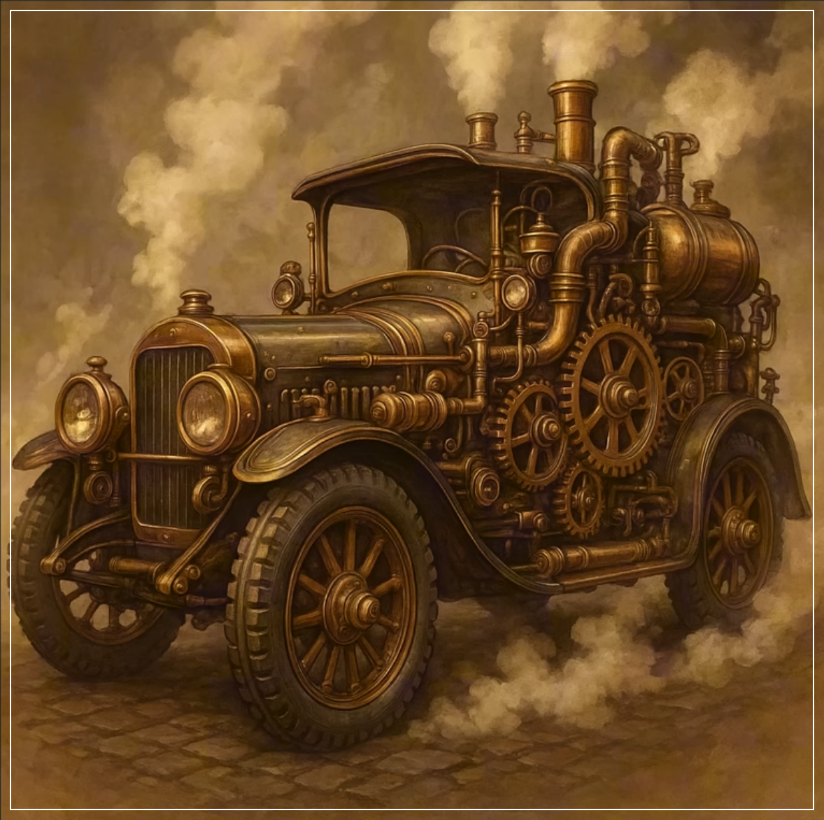Prompt: Create a steampunk image of a vintage car with brass gears, pipes, and steam-powered engines. Square Ratio.