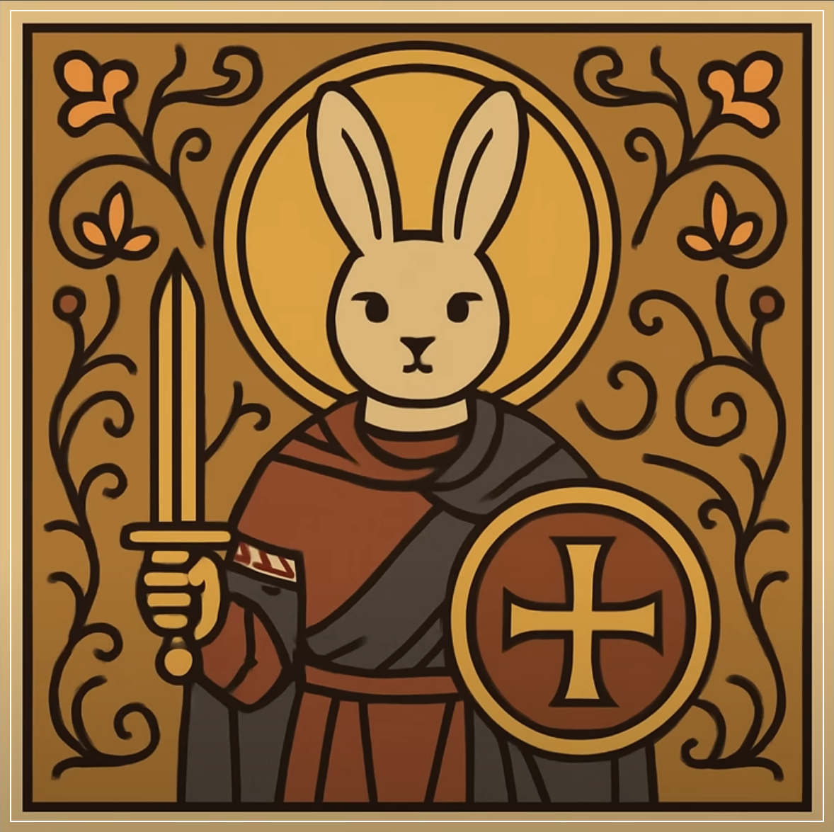 Prompt: Create a Byzantine icon-style minimalist vector style illustration of a warrior bunny figure with a symmetrical, detailed background and gold accents. Square Ratio.