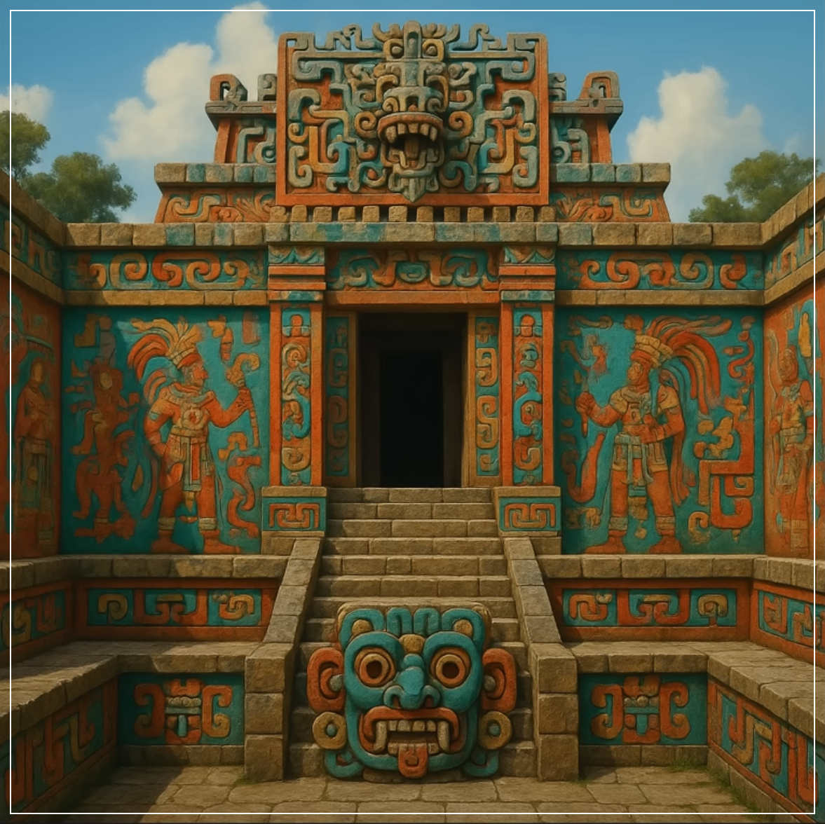 Prompt: Create a Mesoamerican revival image of an ancient temple adorned with vibrant murals and intricate carvings. Square Ratio.