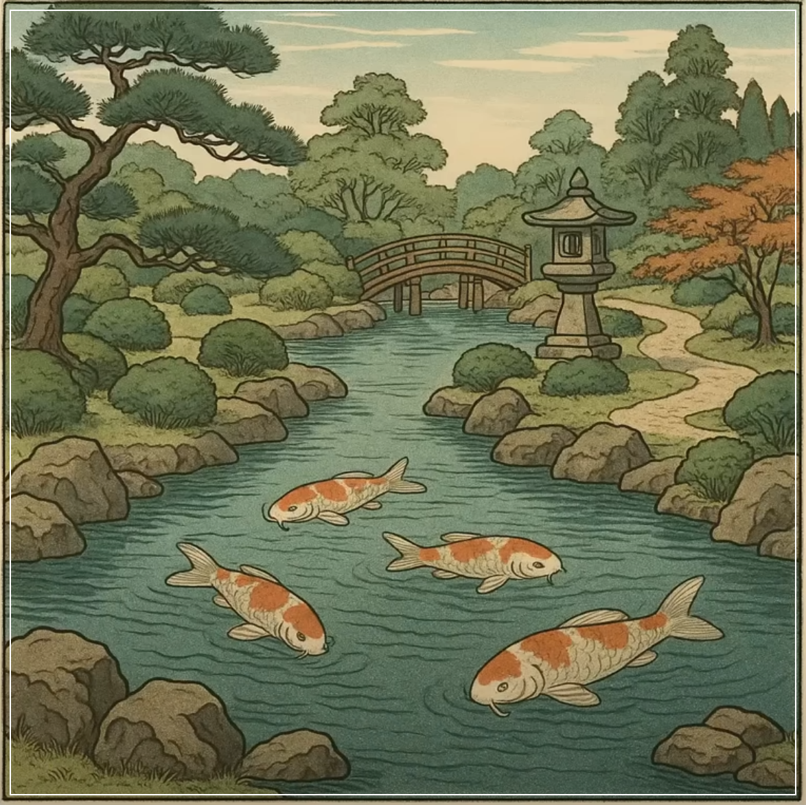Prompt: Create an Ukiyo-e style image of a serene Japanese garden with koi fish swimming in a pond. Square Ratio.