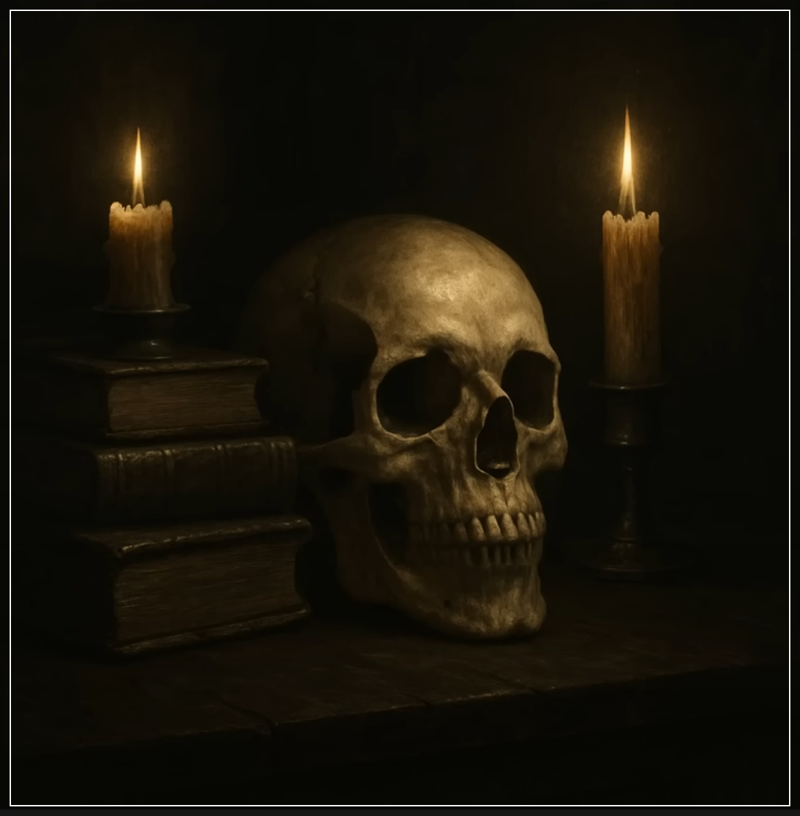 Prompt: Create a Gothic-style still life of a skull, old books, and candles, with dark shadows and dramatic lighting, creating an eerie and somber atmosphere. Square Ratio.