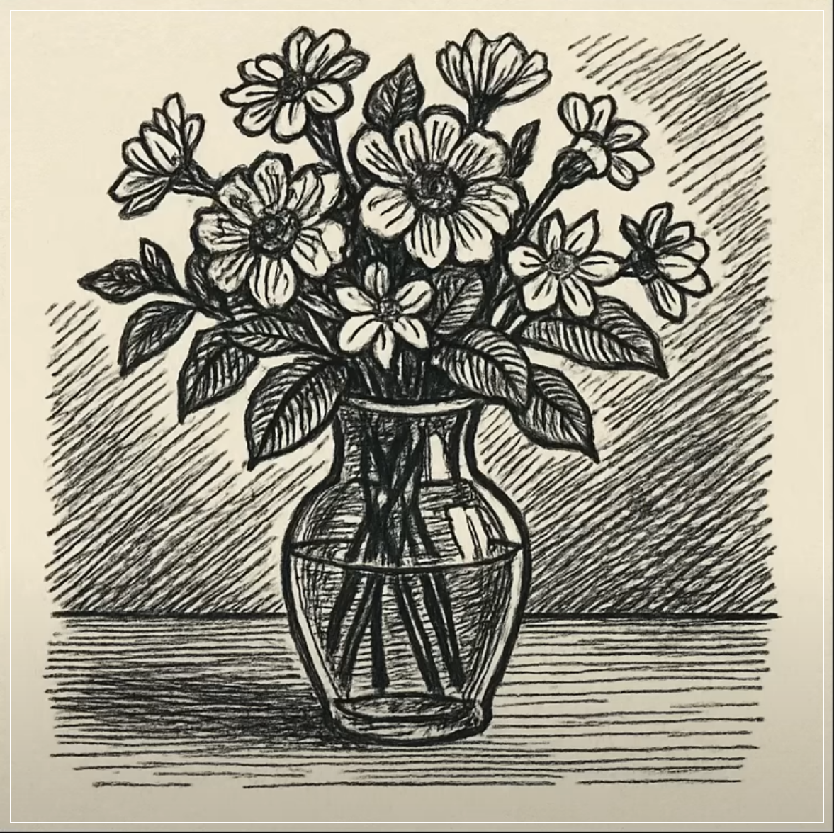 Prompt: Create a felt-tip pen drawing of a vase of flowers on a table, with clean lines for the vase and detailed shading to show reflections and light. Square Ratio.