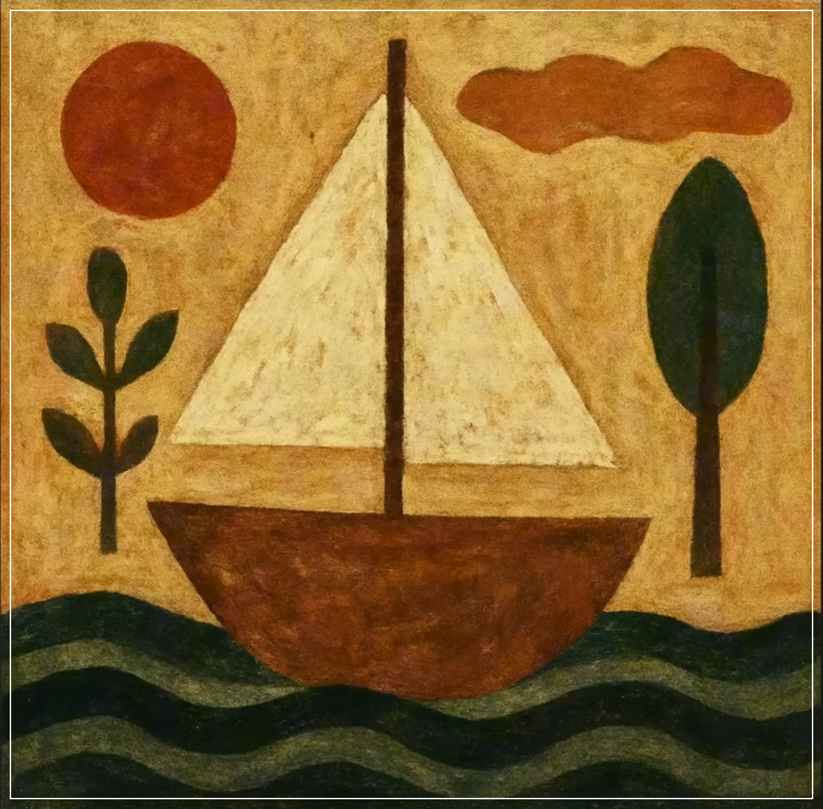 Prompt: Create a neo-primitive art image of a boat with simple, rough shapes and natural elements, blending modern abstraction with ancient forms. Square Ratio.