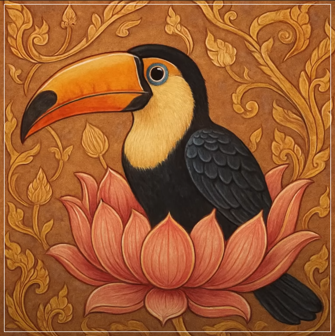 Prompt: Create an Thai mural painting of a toucan bird coming out from a lotus flower. Square Ratio.