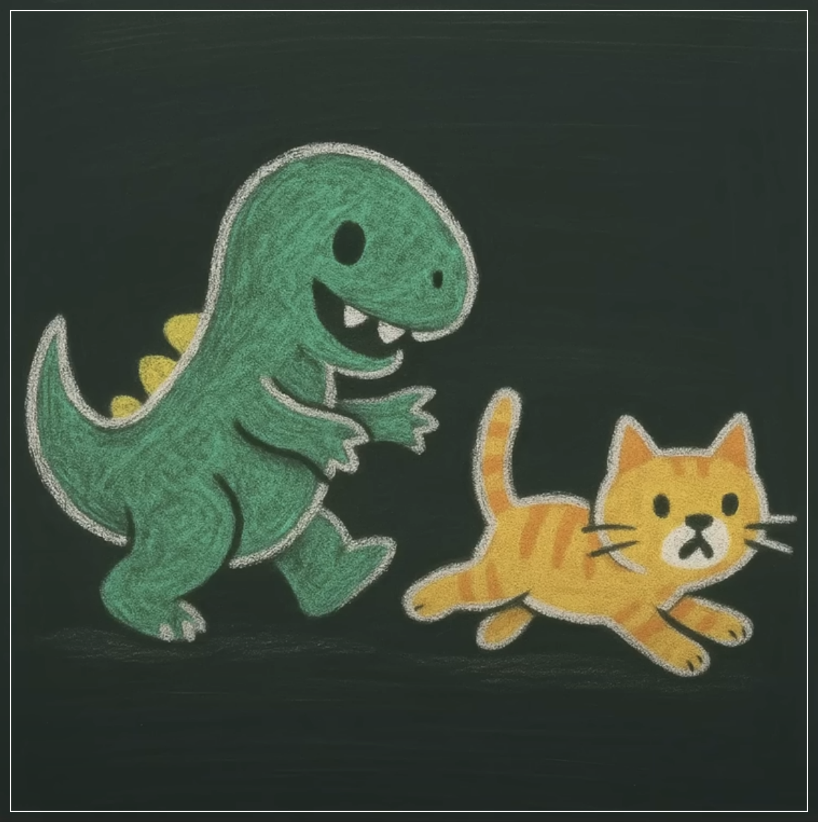 Prompt: Create a chalk art image of a cute dino chasing a cat, on a blackboard. Square Ratio.
