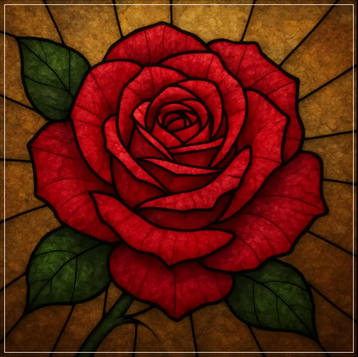 Prompt: Create a stained glass image of a rose with intricate petals, glowing in rich shades of red and pink, framed by dark outlines. Square Ratio