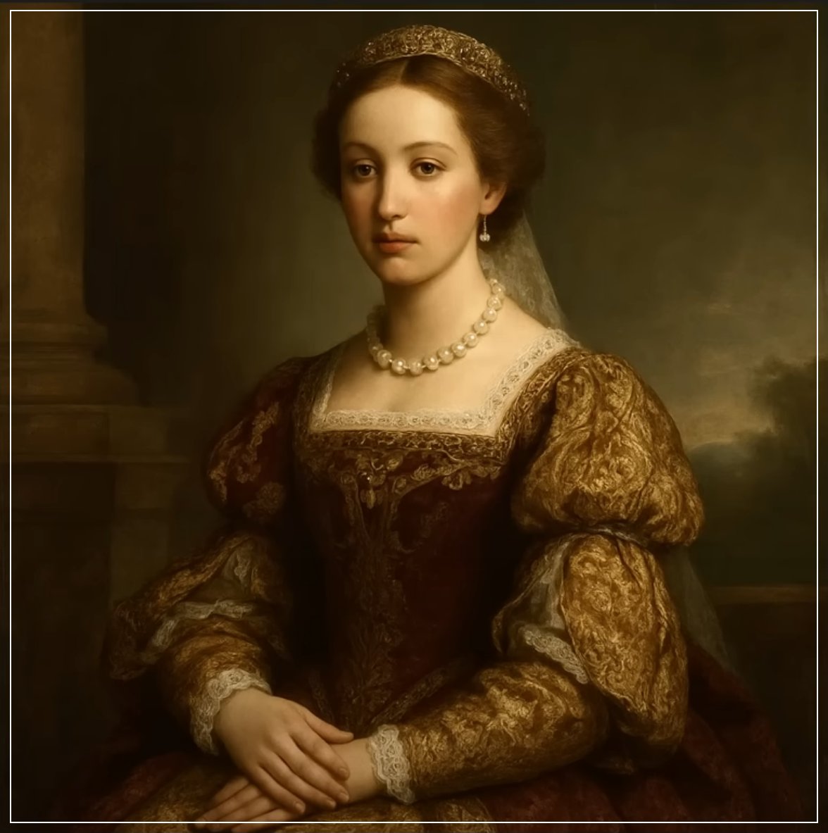 Prompt: Create a Renaissance painting of a noblewoman in an elaborate gown, with soft lighting and delicate details in the fabric and background. Square Ratio.