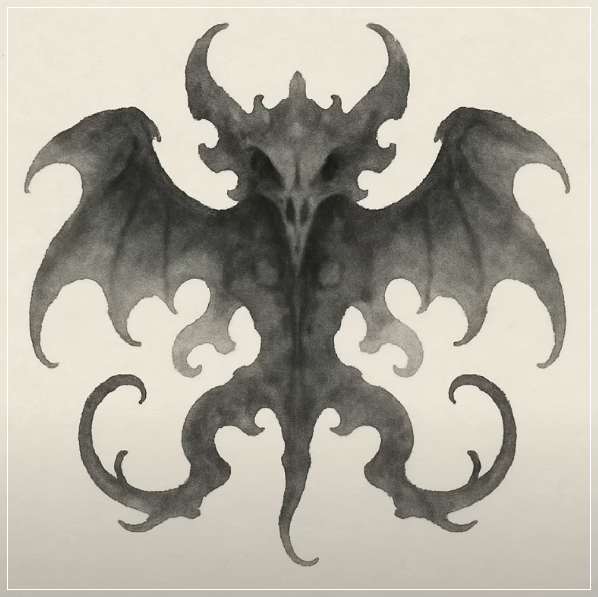 Prompt: Create a surreal Rorschach inkblot piece that evokes the shape of a fantastical creature, using symmetrical, flowing ink splatters to form organic shapes. Square Ratio.
