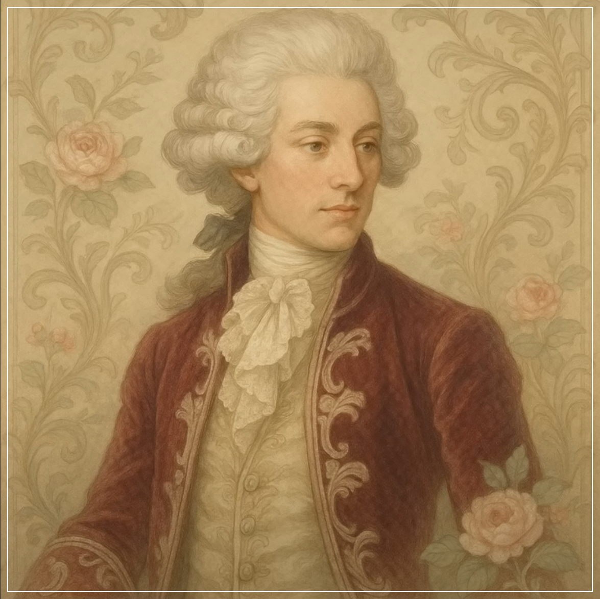 Prompt: Create a Rococo-style fashion illustration of a nobleman in a lavish powdered wig and velvet suit, surrounded by ornamental elements and floral accents. Square Ratio.