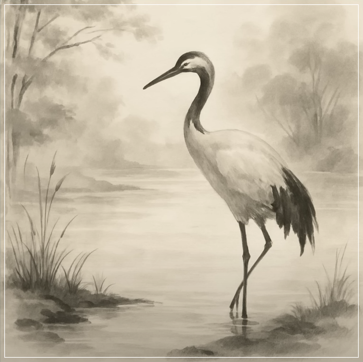 Prompt: Create a Sumi-e painting of a lone crane standing by a tranquil pond, with delicate brush strokes and soft shading to evoke peace and elegance. Square Ratio.