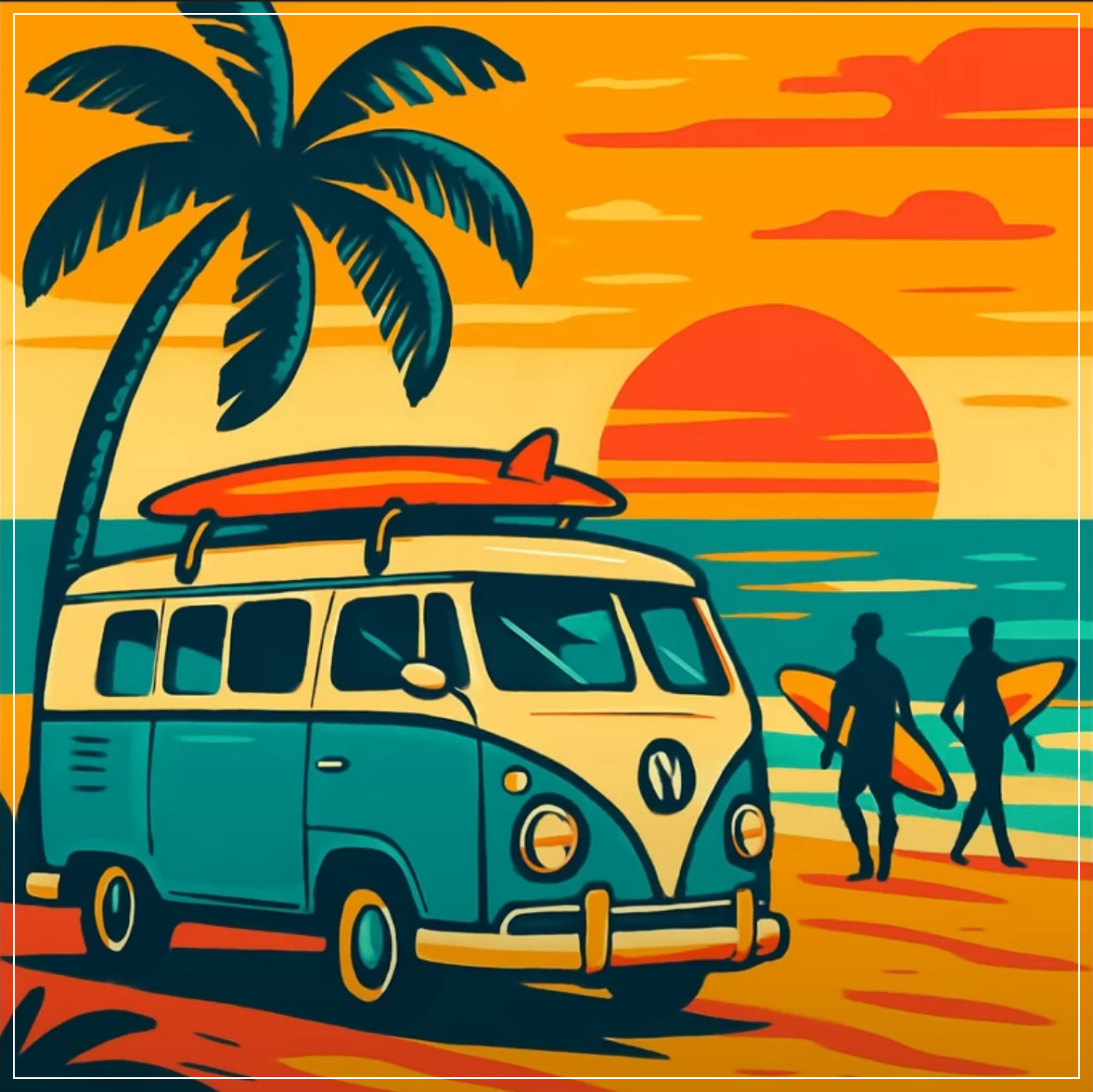 Prompt: Create a retro vector art image of a beach scene with a retro camper van, palm trees, and surfers, all in bright, poppy colors. Square Ratio.