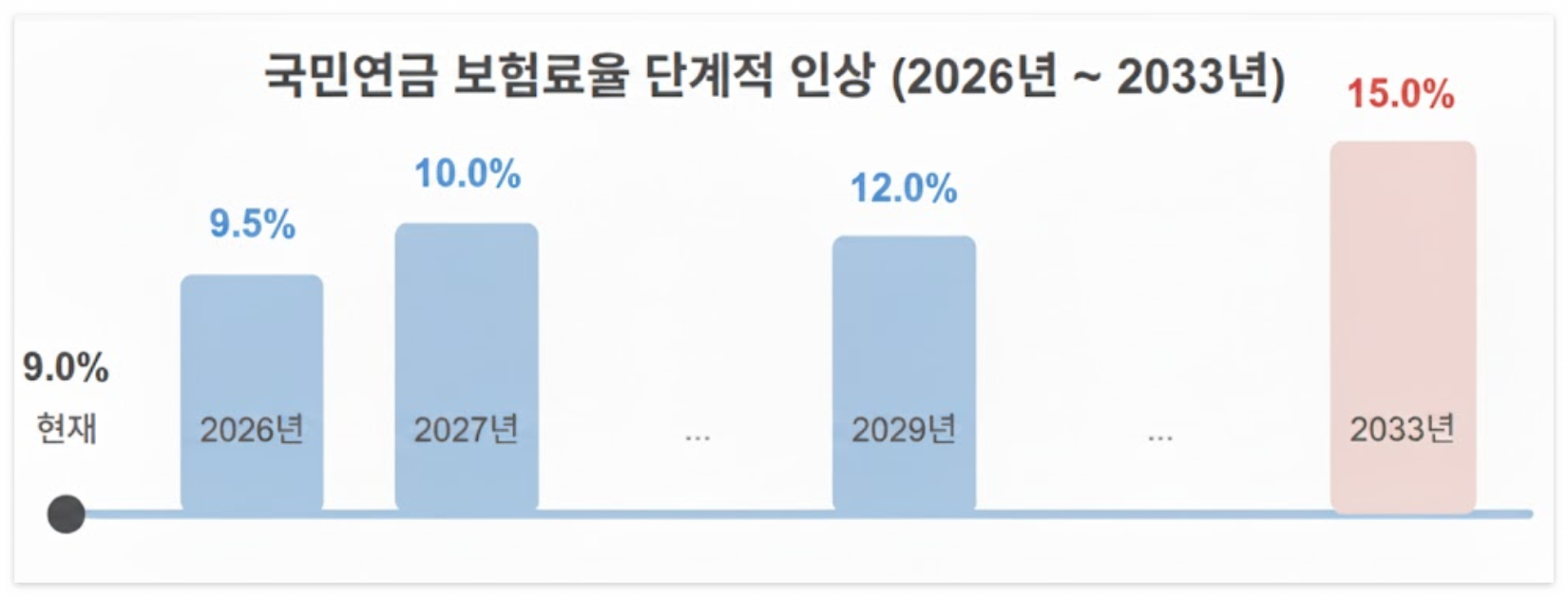 8년간 단계적 인상: 국민연금 보험료율 (9% → 13%)