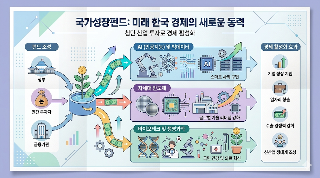 국민 성장 펀드는 둔화된 경제 성장률과 약화된 주력 산업 경쟁력에 대응하여 미래 성장 동력을 육성하기 위해 마련된 대규모 프로젝트입니다. 약 150조 원 규모로 조성되며, 민간과 정부가 함께 참여합니다. 정부 보증채권 기반의 첨단 전략 산업 기금 75조 원과 기업, 금융, 연기금, 개인 투자자의 자금으로 나머지 75조 원을 조성하여 총 150조 원이 만들어집니다.