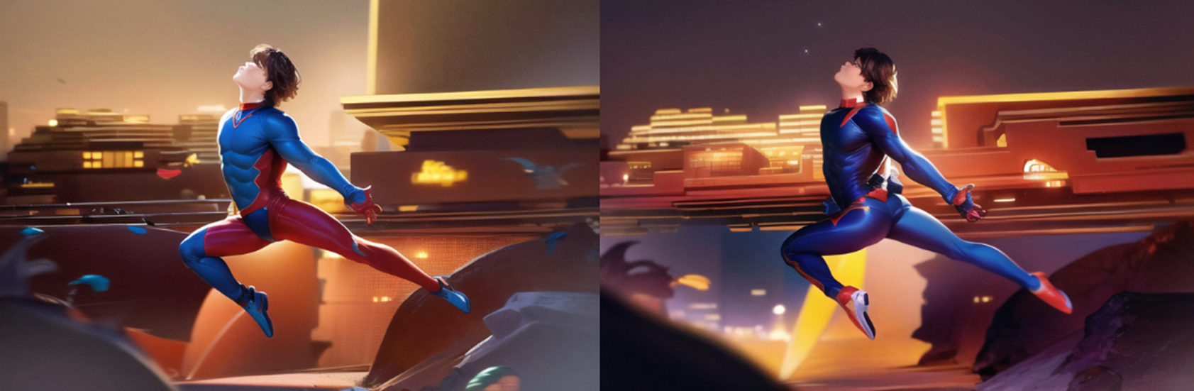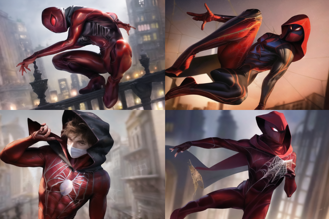 - 이 두 이미지를 합성하되 스파이더맨의 의상과 배경 분위기 등을 가져와서 메인 이미지인 BTS 지민의 동작에 입힐 예정입니다. 아래는 그 결과물입니다.