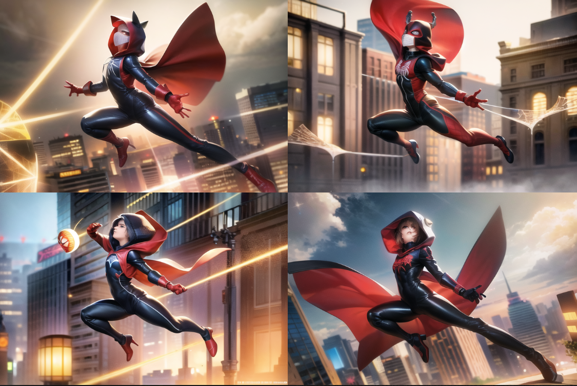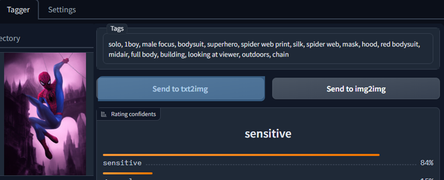 - 스파이더맨을 업로드하고 그에 대한 분석을 보면 solo, 1boy, male focus, bodysuit, superhero, spider web print, silk, spider web, mask, hood, red bodysuit, midair, full body, building, looking at viewer, outdoors 등 을 확인할 수있습니다. 대상 이미지에 이 분위기와 스타일 및 느낌을 적용할 것이기에 hood와 mask는 제외하겠습니다. 이제 위에 [send to txt2img] 버튼을 누르고 이미지를 생성하러 [txt2img] 로 이동합니다.