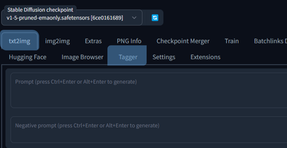 - Stable Diffusion을 실행한 화면입니다. 우리는 여기서 txt2img 탭과 Tagger 탭 정도만 사용하겠습니다.