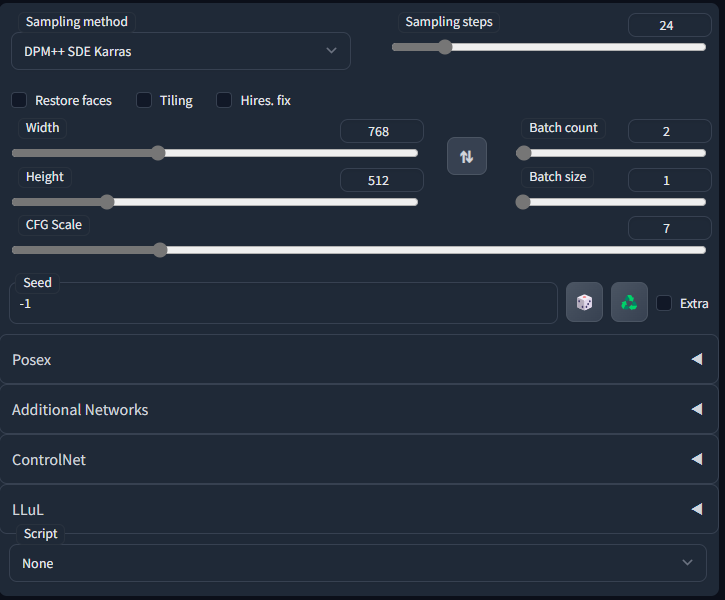 > Sampling Method : 이미지 스타일을 선택할 수 있습니다. 보통 DPM++ SDE Kararas를 이용합니다.