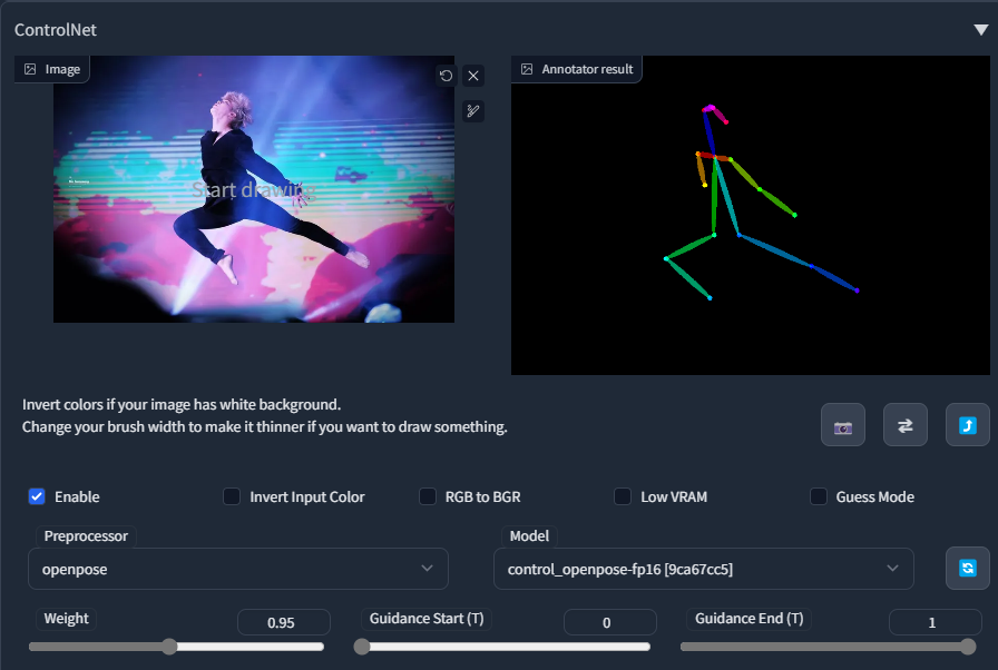 > Preprocessor : openpose, depth, hed, canny, pininet 정도를 사용합니다.