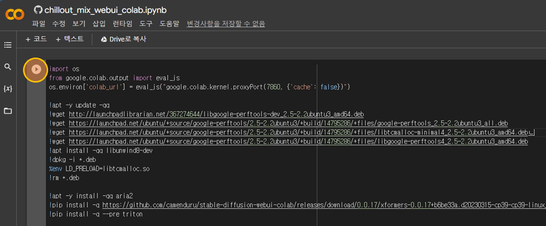 - 위 링크를 타고 이동하면 코랩에서 WebUI Stable Diffusion을 실행할 수 있습니다.