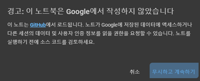 - 위와 같은 팝업창이 생성되고 '무시하고 계속하기' 누릅니다.